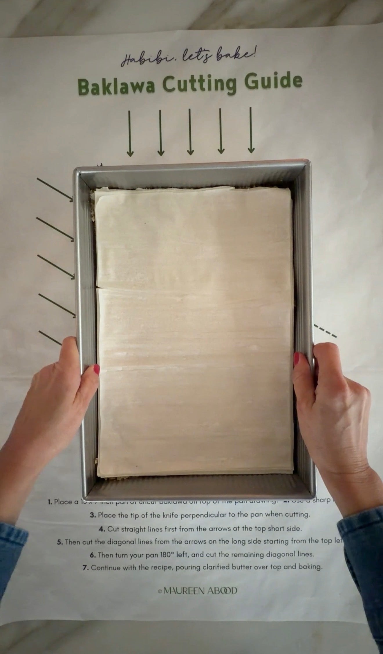 1. Set your 13 x 9 x 2-inch baking pan (filled with phyllo and nuts) over the pan drawing on the guide.