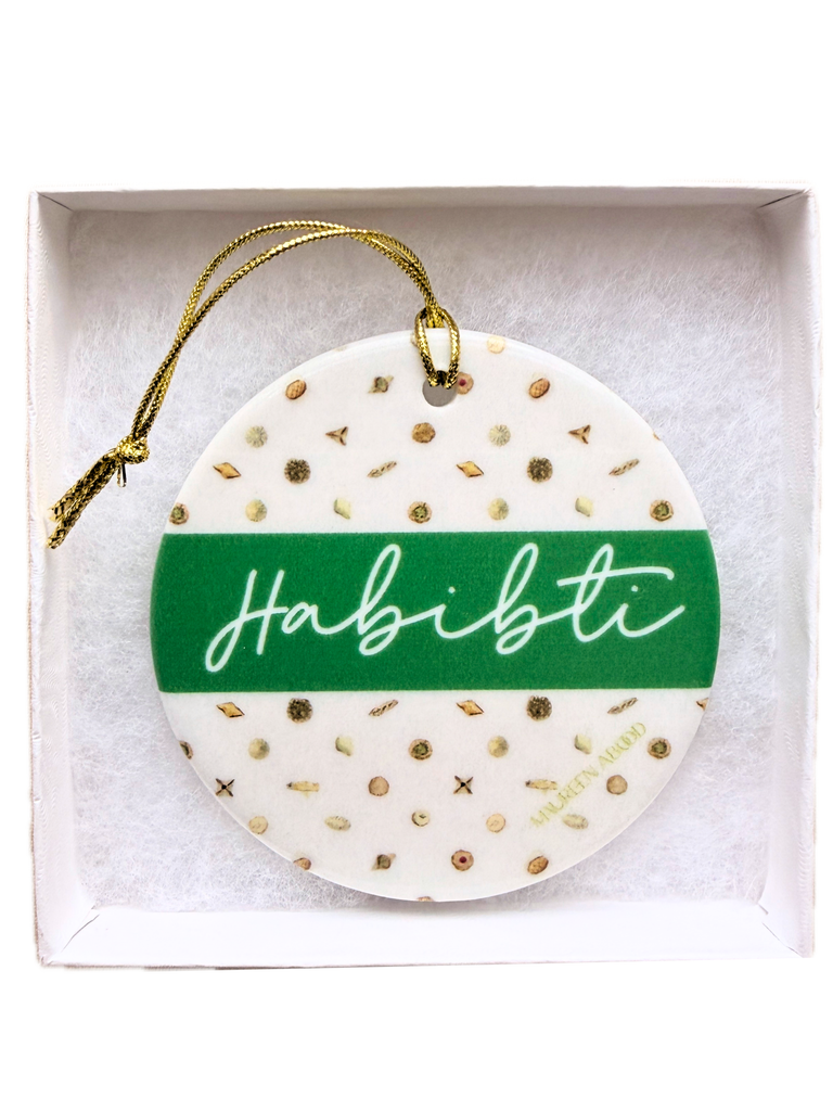 Habibi! Habibti! Our 2025 ornament says this favorite word that means "sweetheart" two ways (one word on each side). This year's ornament includes the custom pattern celebrating Lebanese Baking! Enjoy and share this collectable design full of heart and fun!